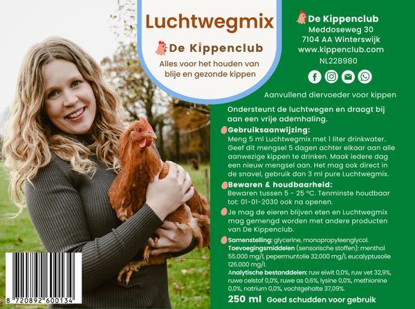 Luchtweginfecties bij kippen zijn erg besmettelijk, als je er niks aan doet wordt het alleen maar erger. Door de hoeveelheid slijm die zich ophoopt kan je kip stikken in het slijm. Luchtwegmix helpt ter ondersteuning van de luchtwegen. Het lost slijm op en behandeld de infectie. Hierdoor worden de luchtwegen weer vrij waardoor je kip makkelijker kan ademhalen.