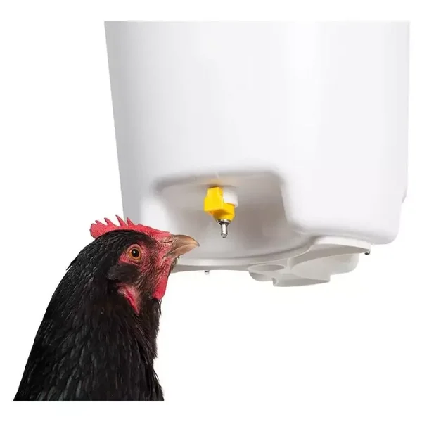 Zeer handige drinkemmer met nippels die al het pluimvee zoals kippen, ganzen, fazanten en eenden voorziet van altijd schoon en vers drinkwater.