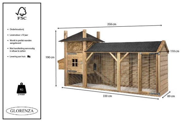 Kippenhooiberg Lyn beschikt over een leuk nachthok en een volledig overdekte uitloopren. Het is een groot kippenhok vol karakter. Het legnest is bij dit verblijf vast aan het nachthok geplaatst en is voorzien van een openklapbaar dak wat het rapen van eieren super makkelijk maakt! In het nachthok is een zitstok geplaatst. Het nachthok zelf is hoog van de grond geplaatst om kou en optrekkend vocht tegen te gaan. Om het voor de kippen eenvoudig te maken om het nachthok te betreden leveren we een trapje mee. Het verblijf is gemaakt van hoogwaardige onderhoudsvrije materialen waardoor het een levensduur heeft van wel 10 tot 15 jaar. Kippenhok hooiberg Lyn wordt op afspraak bij u thuis geleverd in gemonteerde panelen. Deze moet u zelf nog aan elkaar monteren, hiervoor wordt u per e-mail een handleiding toegestuurd.