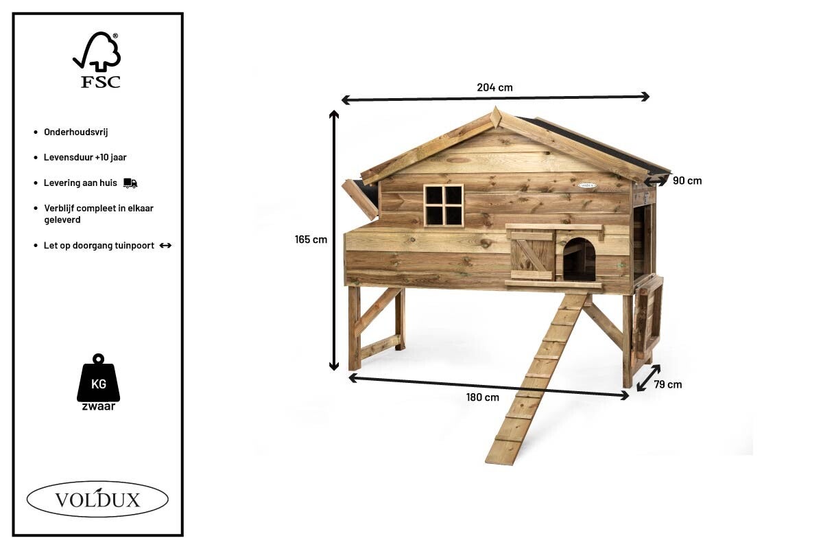 Dit verblijf wordt geproduceerd door gespecialiseerde vakmannen van Voldux die zorgen voor een perfect resultaat. Het verblijf wordt volledig gemaakt van geïmpregneerd hout. Afmeting van (l) 140 x (b) 90 x (h) 155 cm. Afmeting XL van (l) 204 x (b) 90 x (h) 165 cm. Dit maakt het hok onderhoudsvrij en zeer geschikt voor buiten.