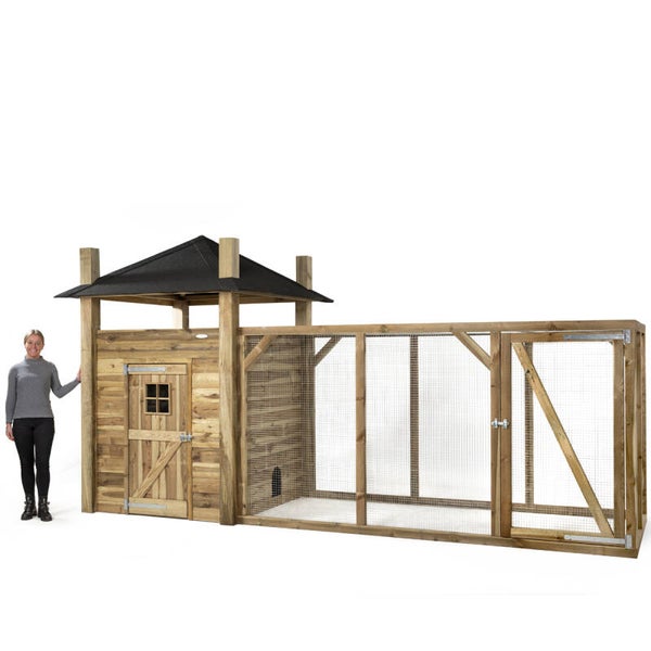 Dit duurzame kippenhok is handgemaakt met het gebruik van onderhoudsvrije materialen. Het kippenhok met de welke is voorzien van een nachthok, hooiopslag én ruime kippenren heeft een totale (buiten) afmeting van (l) 462 x (b) 175 (h) 225 centimeter en biedt hiermee ruimte voor het huisvesten van meerdere kleine óf grote kippen. Het handgemaakte kippenhok Loes heeft de klassieke kenmerken van een kippen hooiberg. De hooiberg is opgebouwd op een stevige constructie van geïmpregneerde balken en is afgewerkt met rabatdelen. De dakconstructie rust op de vier stevige robuuste balken van geïmpregneerd hout, onder het dak bevindt zich een open ruimte welke gebruikt kan worden voor de opslag van hooi en stro. Het dak van de hooiberg is voorzien van stevig dakleer waardoor een perfecte afwatering ontstaat op het verblijf. Aan de voorzijde beschikt het kippen nachthok over een grote toegangsdeur welke kan worden afgesloten en is voorzien van een plexiglas venster. Het nachthok is bovenal voorzien van een ruim legnest voor jouw hennen én een zitstok voor de nacht. De aangrenzende kippenren is vanuit het nachthok via een vrije doorgang eenvoudig te betreden. Deze kippenren biedt veel scharrelruimte voor jouw kippen en hiernaast volledig gesloten door het gebruik van stevig gaas. De kippenren is gemaakt van geïmpregneerde balken en is hiernaast voorzien van een toegangsdeur aan de voorzijde. Dit veelzijdige kippenhok biedt al het comfort, de ruimte én de veiligheid die jouw kippen nodig hebben.