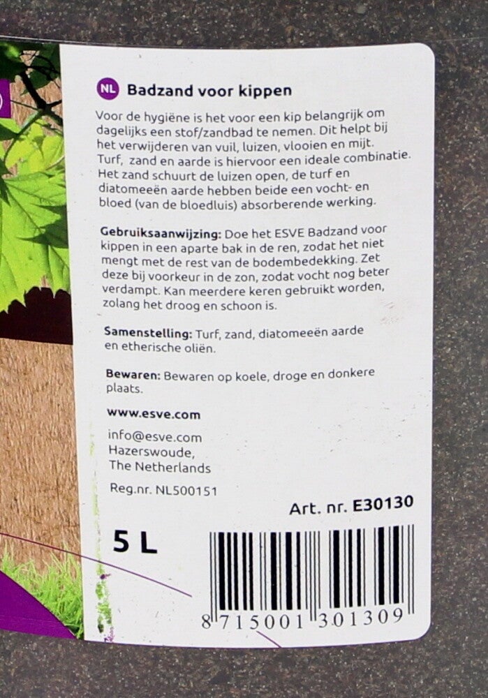 Doe het ESVE Badzand voor pluimvee in een aparte bak in de ren. zodat het niet mengt met de rest van de bodembedekking. Zet deze bij voorkeur in de zon zodat vocht nog beter verdampt. Kan meerdere keren gebruikt worden zolang het droog en schoon is.